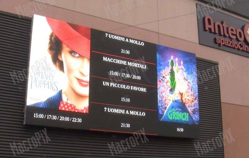 E’ stato inaugurato da pochissimo il Treviglio Anteo spazioCinema che dispone di 6 sale per un per un totale di 1277 posti. Tra gli elementi innovativi Macropix ha avuto un ruolo importante. Infatti sono stati installati su entrambi i lati di ingresso due schermi a led Signum passo 6, specificatamente studiati per l’outdoor, ad alta luminosità.