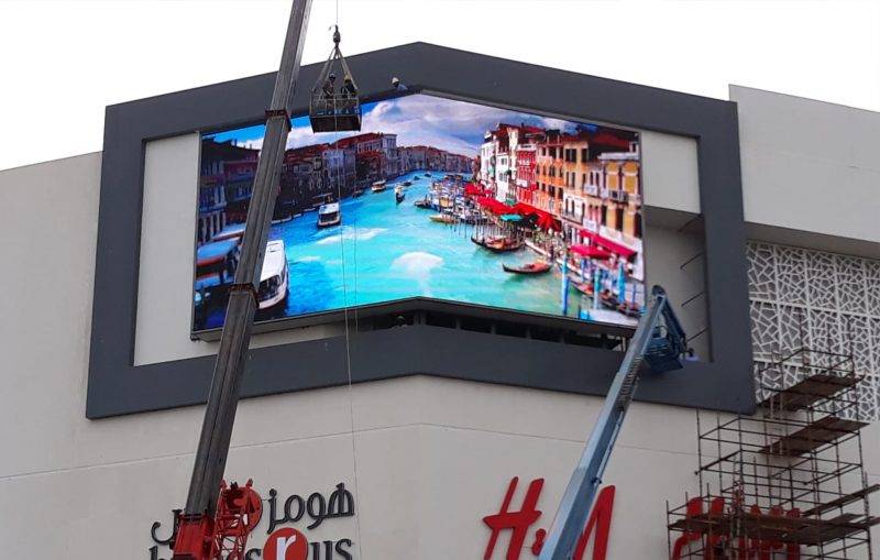 Per lo schermo esterno, abbiamo un muro inclinato di 45° pertanto il disegno meccanico doveva essere studiato in modo tale che la struttura potesse essere facilmente integrata. Il reparto di progettazione di Macropix ha studiato una soluzione ad hoc per superare questo impedimento strutturale per far si che lo schermo venisse integrato senza alcuna difficoltà. L’installazione è avvenuta con successo con la piena soddisfazione del cliente finale.