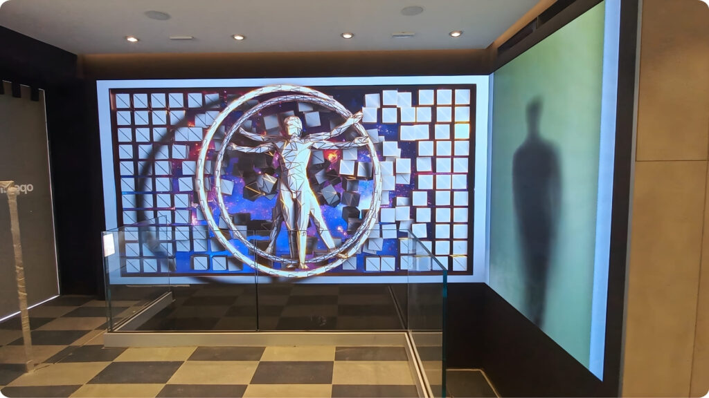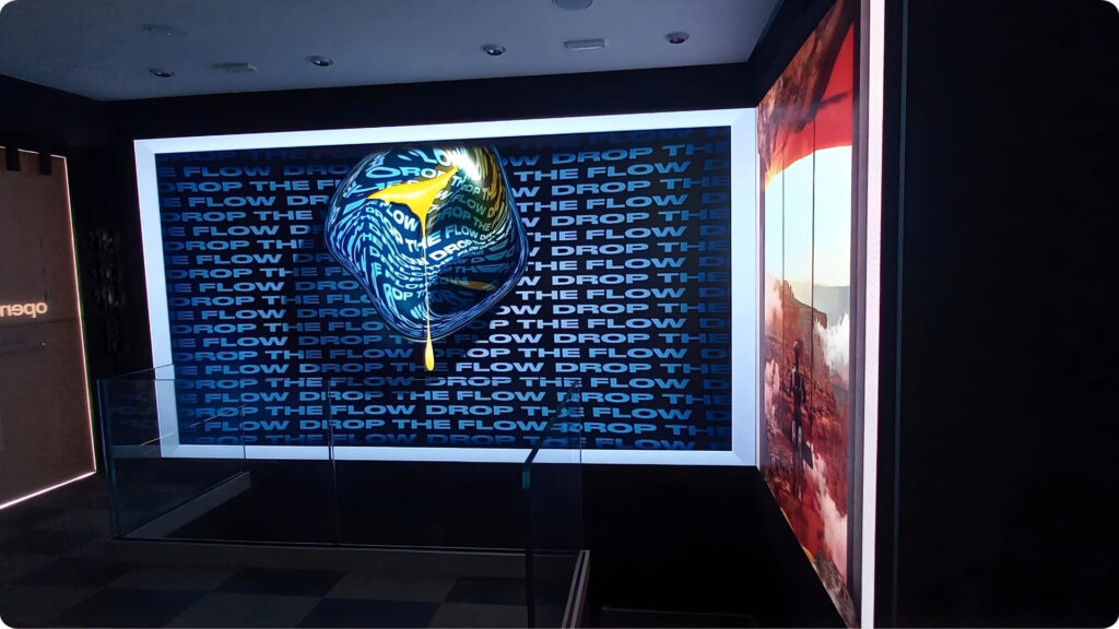 Nel negozio Bomboogie di Verona, il primo impatto è tutto. Appena si varca la soglia, lo sguardo viene catturato da una parete luminosa che non si limita a occupare uno spazio: lo ridefinisce. Una cascata di luce e immagini che abbraccia l’angolo del locale, piegando con naturalezza dal lato lungo a quello corto della stanza, come se fosse un unico, grande quadro in movimento che respira insieme al negozio.