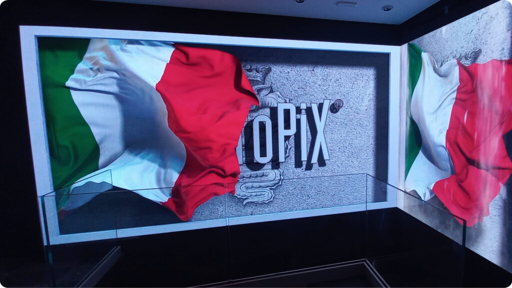 Questo è il progetto firmato Macropix per Bomboogie, brand di abbigliamento del gruppo Space 2000 Spa, una delle realtà più dinamiche nel panorama del retail italiano. L’installazione è composta da due display LED affiancati che, insieme, danno vita a una cornice di luce continua e ininterrotta: uno schermo da 448 × 240 cm e uno da 192 × 240 cm, perfettamente integrati in una superficie visiva unitaria dove scorrono logo e immagini del brand, trasformandosi in un elemento d’arredo vivo e pulsante.